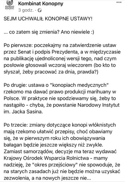 Według przedstawicieli Kombinatu Konopnego, najważniejszym punktem zaakceptowanej ustawy jest podniesienie limitu THC w konopiach włóknistych do 0,30%. Cały tekst KK znajdziecie tutaj.